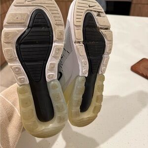 Nike Air Max 270 with white mesh and black accents. Features a sleek design and cushioned heel.