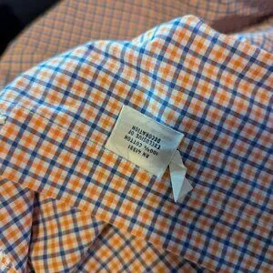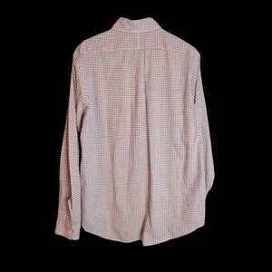 This is a wonderful Men's Ralph Lauren Orange Blue and White Long Sleeve Button Down Plaid Shirt in a size Large.