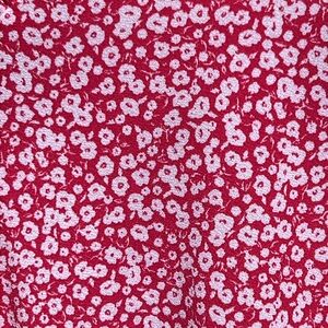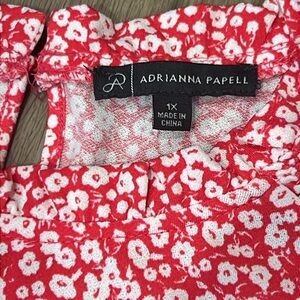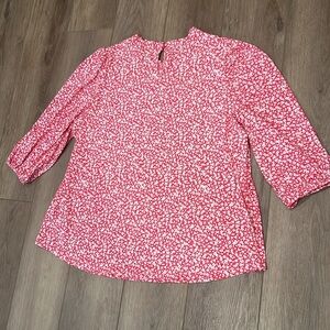 Adrianna Papell raspberry pink blouse with a delicate floral pattern in EUC (no visible flaws, no visible signs of wear). Features a round neckline with ruffles and 3/4 sleeves with elastic cuffs. Peekaboo hole in back with button closure. Extra button attached to care tag. Size listed is 1X. Approximately 28” in length and 24” pit to pit laying flat.