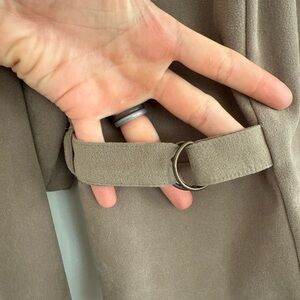 A beautifully structured taupe faux-suede jacket by Dorby Studio featuring a plaid interior, antique brass buttons, and adjustable waist tabs for a custom fit. Soft to the touch with a refined, tailored look that pairs effortlessly with denim, trousers, or dresses. Women’s Size 10.
