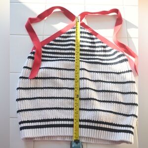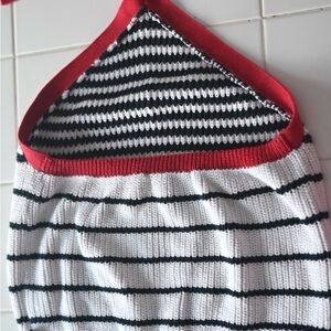 White and navy blue striped ribbed knit halter top with bold red straps. Soft, stretchy, and flattering cropped fit. Classic Y2K vintage inspired style—perfect for summer or layering.