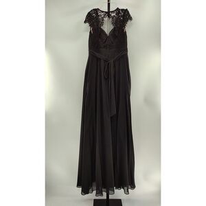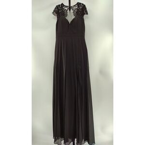 Chic black maxi dress. Features lace cap sleeves. Flattering sweetheart neckline. High slit for added elegance.