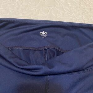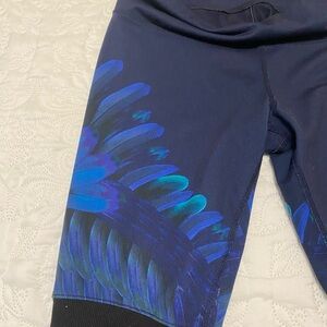 This is a pair of Alo Yoga Gypset Goddess leggings in a rich navy feather print with ribbed black detailing.
