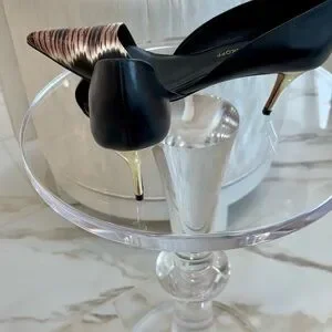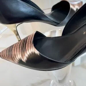 Elegant black heels with shimmering gold accents. Perfect for a stylish look.