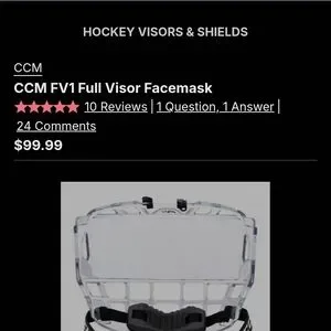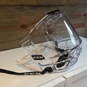 Durable full face transparent visor. Features a secure black strap. Ideal for ice hockey safety. Like new, used maybe twice, husband went in a different direction.