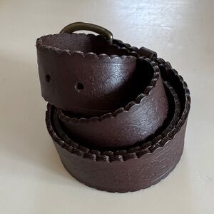 Gorgeous and durable dark brown leather belt with embossed design and scalloped edge. Classic burnished gold buckle. Quality vintage item with little use. 1.5” wide strap. Strap 41” end to end with five holes at 34”-38”. Buckle 1.5”L and 2”W