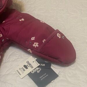 Charming pink snowsuit with floral accents. Includes a cozy hood.