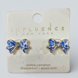 Gold-tone bow stud earrings by Influence New York featuring a blue-and-white floral design with a clear crystal center. Sweet, feminine design with a vintage-inspired feel—perfect for everyday wear or gifting.