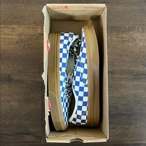 Vans shoes featuring a blue and white checkered design. Accented with green and black laces.