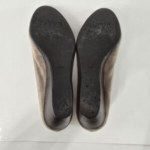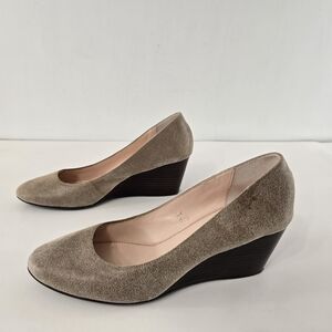 In excellent condition, these classic neutral tone slip on in wedge style sueded leather shoes are the perfect color to complement all your business casual outfits. Wood look platform wedge heel. Anthro. Size 6 1/2. Office work business timeless capsule footwear minimalist capsule minimalism minimal wardrobe. Mocha mousse.