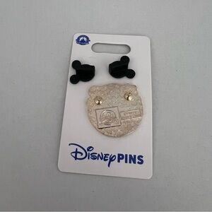 Gold metal with 2 pin posts. Mickey head pattern on the back along with a 2012 Authentic Official Pin Parks Logo and a box containing: