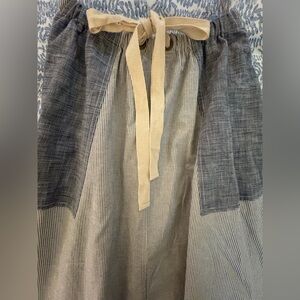 The Theodora Skirt is cut from mid-weight cotton stripe, which has been woven into the fabric. This handkerchief hem style skirt has oversized pockets in a contrast shade of grey, with a drawstring waist and self-fabric tie. No tags but never worn- it’s one size too large for me.
