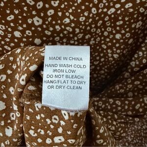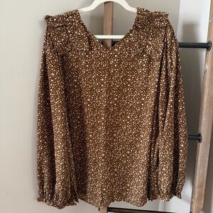 Lightweight brown leopard print blouse featuring a flattering V-neckline, ruffled shoulder detail, and flowy long sleeves with elastic cuffs.
