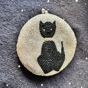 VINTAGE teeny BEADED BLACK CAT kisslock coin purse jewelry box BLACK & WHITE