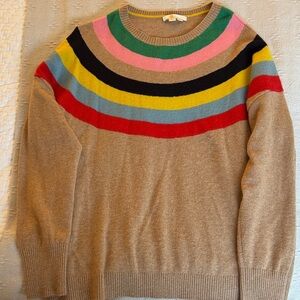 Stylish crewneck sweater with bold stripes. Features camel base with vibrant accents. Perfect for brightening up these long winter and spring days! You will love this sweater!