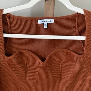 Soft ribbed knit bodysuit in a gorgeous rust tone featuring a flattering sweetheart neckline and long sleeves. Stretchy, comfortable fabric with snap closure makes this an easy piece to dress up or down.