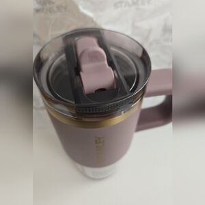 Elegant Stanley tumbler with a comfortable handle. Features a rich color and gold trim.