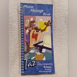 Stay organized with the Taz Phone Message Book . Featuring a fun design , this book is perfect for keeping track of important messages . Measures 11 inches tall , 5 1/4 inches wide & 3/4 inch thick . Featuring Tazmanian devil on office etiquette . Add some fun to your everyday office work . Alternating 4 different designs every page with their yellow copy . 400 carbonless sets . Each message measure 3 x 4 1/2 inches . Gift idea for collectors and fans or addition to your desk . An official Looney tunes product . Made by Adams Business Forms inc for Warner brothers in 1997