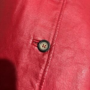 stunning vintage Dennis Basso genuine leather tuxedo vest. Crafted in a bold, rich cherry red, this piece perfectly balances classic tailoring with a modern pop of color. Featuring a flattering V-neckline, functional front pockets, and a sleek button-down front, it’s the ultimate statement piece for any wardrobe.