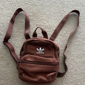 Compact Mini Adidas backpack in brown corduroy. Features adjustable straps and front zip pocket. Ideal for daily essentials.