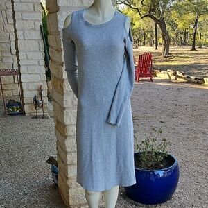 Elegant gray knit dress with stylish cold shoulder design. Perfect for any occasion.