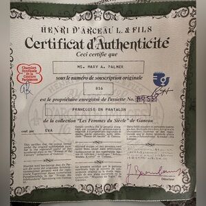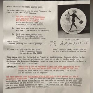 This is a truly timeless piece produced in France. Made of porcelain it has its original hanger in perfect condition. No scrapes or notable paint flaws. This piece comes with the Certificate of Authenticity, the original order for North America instructions and the Women of the Century advertisement. You can find these plates in false reproduction or without the complete inclusion of the COA but very rare in this condition, with all of the original paperwork. This item has been stored in its protective case originally shipped to North American in 1979 and is in pristine condition.