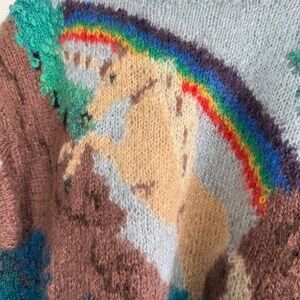 Vintage 1980s mohair sweater. Rare landscape design with a unicorn on the front and back alongside a river, trees, mountains, and rainbows. The detailing on the tree and water has hand-knitted texture.