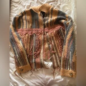 Chic cardigan with earthy stripes. Features intricate lace detail. Perfect for layering.