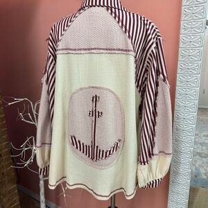 POL Button down waffle/striped denim jacket with a patchwork anchor design on the back. Oversized fit with balloon sleeves.