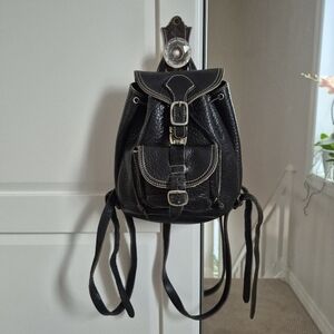 It features a beautiful pebbled leather texture, a flap closure with silver buckles, and a drawstring main compartment. Raw leather suede texture/ hem inside.