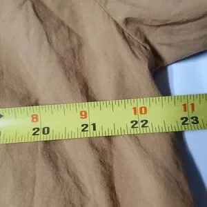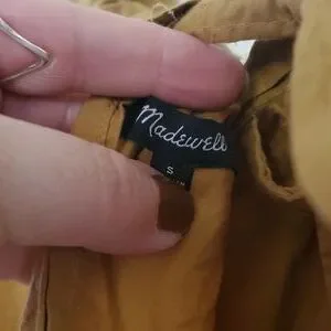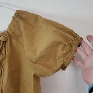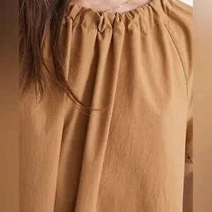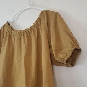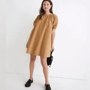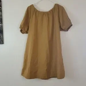 Madewell cotton puff sleeve mini dress with pockets and tie neck on back size small. Neutral toffee camel color. Good pre-owned condition. Approximate measurements provided. Great fall/autumn dress for many occasions. Pictures, pumpkin patch, Thanksgiving ect. Very versatile. It is an easy piece to layer. Minimalist. Contemporary. Preppy. Business Casual. Office. Holiday. Party.