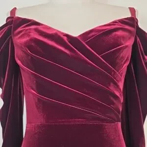 Get ready to turn heads in this GORGEOUS stunning Theia Anita gown. Made from sumptuous stretch velvet, it feels like a hug and looks like a million bucks. The sweetheart neckline and off-the-shoulder long sleeves give it that perfect mix of classic romance and modern edge. Designed with a built-in stretch bustier, you get a flawless, secure fit that stays put while you move. It’s the ultimate "effortless glam" look for when you want to look polished but still feel like yourself.