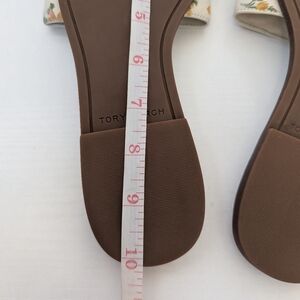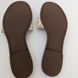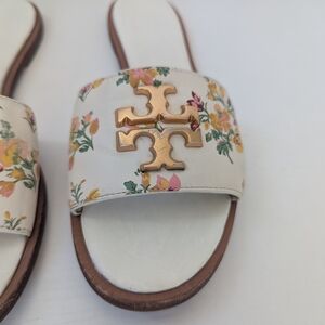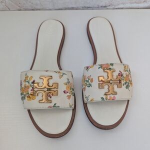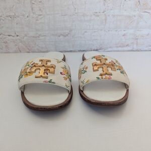 Tory Burch Everly Slide sandals with a white or cream base and a multi-color floral print. They feature the signature gold-tone Double T logo on the upper strap.