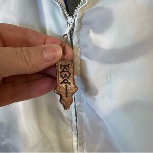 White nylon exterior, interior blue and green Hawaiian print that shows through to the exterior
