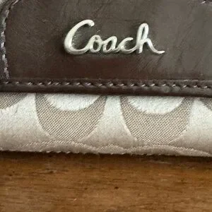 Stylish Coach wallet in light brown and taupe with dark brown leather trim. Features signature pattern. Ideal for daily use.