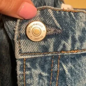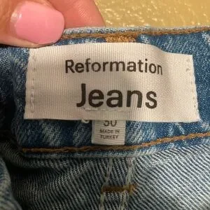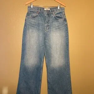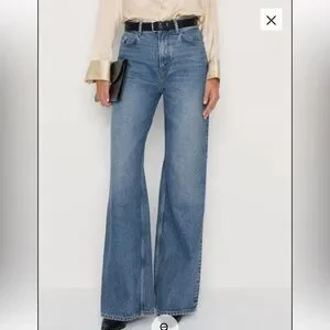 Chic wide-leg jeans by Reformation. Stylish blue denim with a flattering flare. Perfect for a modern look.
