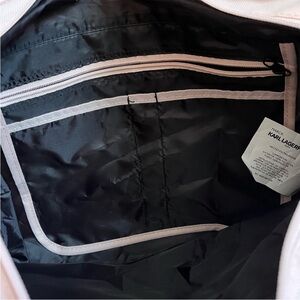 New without tags Karl Lagerfeld Paris Pink Cat Logo Tote. Top-zip closure. 9" double top handles. Black-tone exterior hardware. 2 interior slip pockets, 1 Zipper pocket. 1 Back zipper pocket. Polyester. 14'H 14"L 5"W