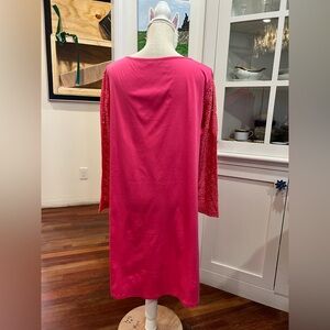 Chic Dior dress in vibrant pink cotton . Features long lace sleeves. Perfect for stylish occasions.
