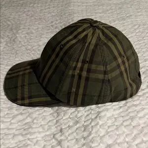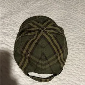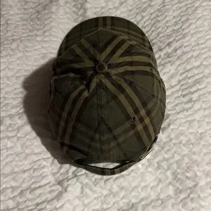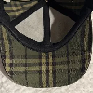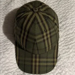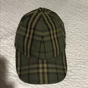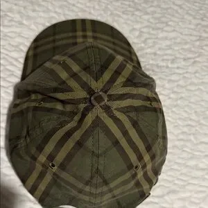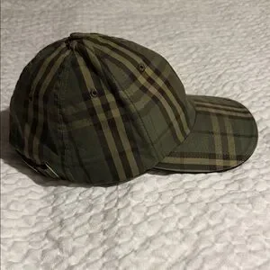 Chic Authentic Burberry cap with olive and brown plaid design. Ideal for everyday superb style. It has silver fastening hardware. It was only worn on vacation for a short period of time. It comes from a pet, dog, friendly home. If you have any questions, please feel free to ask.