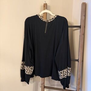 Soft black long sleeve top featuring leopard print trim at the neckline and sleeves with a functional half-zip detail. Relaxed fit with cozy stretch, perfect for casual everyday wear with a little edge.
