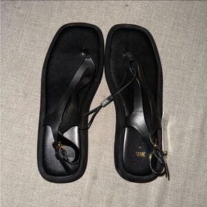 Flat leather sandal style shoes. Between finger. Thick wedge sole. Buckle strap closure at the ankle.