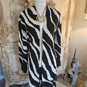 Stylish and bold, this black and white zebra print sweater is perfect for making a statement. Its unique design adds a touch of elegance to any outfit. Heavy weight fabric open front sweater with lots of stretch. 24 inches armpit to armpit, 44 inches in length and 26 inch sleeves. Removed my tags including size tags prior to deciding to keep.. so soft and very nice.