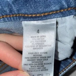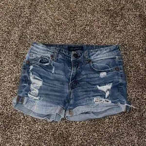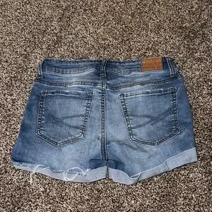 Trendy distressed jean shorts. Classic blue denim. Rolled hem design.