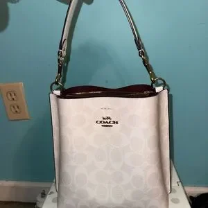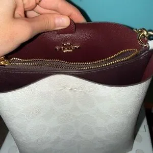 Chic Coach crossbody bag in ivory. Features gold hardware. Stylish and versatile.