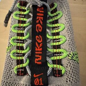 Dynamic Nike sneakers with a gray base and neon green highlights.