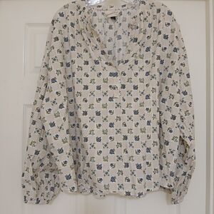 Elegant blouse with floral pattern. Features blue and green details on a cream base. Ideal for casual or office wear.