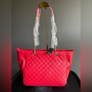 This stunning red vegan buttery leather tote from Badgley Mischka features a luxurious quilted design. Gold tone hardware