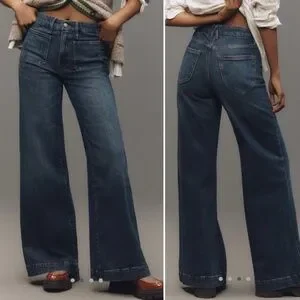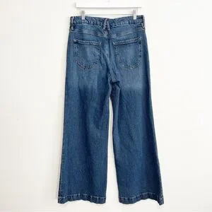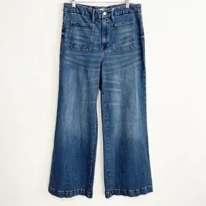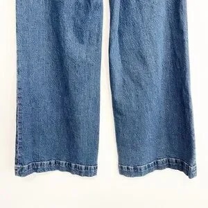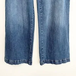 Sold at Anthropologie - Good American Good Waist Palazzo wide leg trouser jeans with patch pockets in a medium wash denim, cotton blend with stretch, high rise with zipper fly, longer inseam with trouser cuff. Great pre-owned condition. Offers welcome!