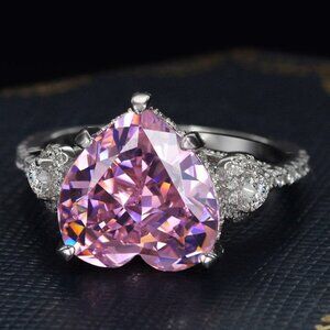 😍Pink Heart CZ Anillos Shiny Diamonds Silver Plated Heart Ring for Women, L117