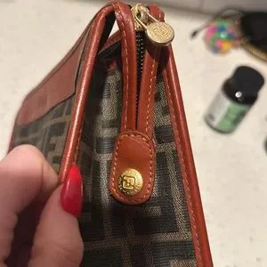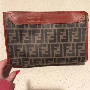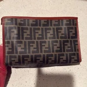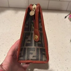 Elegant Fendi Zucca leather and canvas toiletry bag with iconic monogram. Rich brown leather accents. Ideal for travel.
